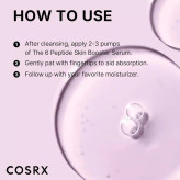 یکی از پرفروشترین محصولات برند COSRX با تأثیر فوری و قوی در کاهش چین و چروکها، آبرسانی عمیق پوست و روشن کنندگی، سرم پپتاید کوزارکس است. این سرم حاوی 6 پپتید فعال است که خاصیت تقویت کننده کلاژن، بازسازی بافت پوست، روشن کننده، آرامشبخش، سفت کننده و مراقبت از چربی اضافه پوست دارد. بوستر سرم تقویت کننده ۶ پپتاید کوزارکس ساخت کره است. ترکیبات مغذی و فعال این سرم با انواع پوست بهویژه پوست حساس سازگار است